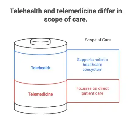 Telemedicine refers specifically to clinical services, like diagnosis and treatment, delivered by a health care provider via secure digital channels. Telehealth, on the other hand, is a broader umbrella. It includes telemedicine plus services like remote patient monitoring, administrative communication, mobile health tools, and training. Telehealth policies also tend to cover both clinical and non-clinical care models.