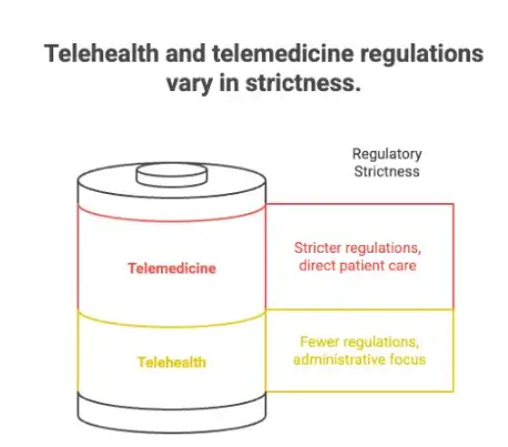 Telemedicine typically faces stricter regulatory oversight than telehealth because it deals directly with patient care. That means: