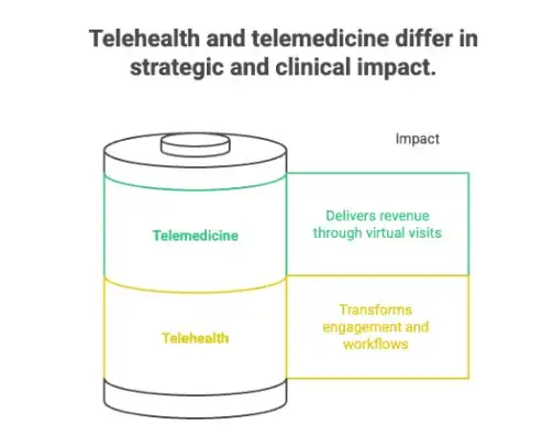 Clinics need to recognize this distinction. With telemedicine, patient interaction is live, clinical, and billable. With telehealth, interaction can be passive, educational, or non‑clinical, which adds engagement and support without necessarily needing real-time contact. Most modern clinics offer a mix: telemedicine for clinical care, and telehealth tools like portals or RPM to keep patients engaged outside appointments.